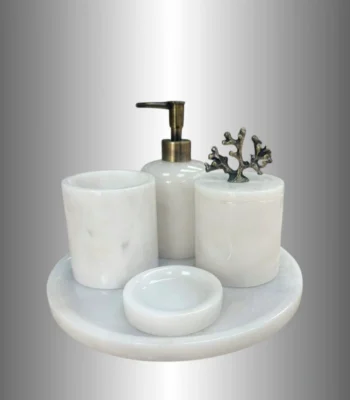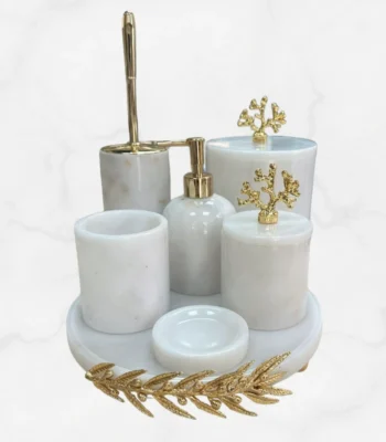 Banyonuzda göz alıcı bir şıklık ve düzen arıyorsanız Beyaz 9'lu Gold Banyo Seti, tam size göre! Doğal mermerin eşsiz dokusu, altın kaplama detaylarla buluşarak banyonuzda adeta bir sanat eseri yaratır. Her bir parçası özenle tasarlanmış bu set, zarif görünümüyle banyonuza lüks bir dokunuş katar.
