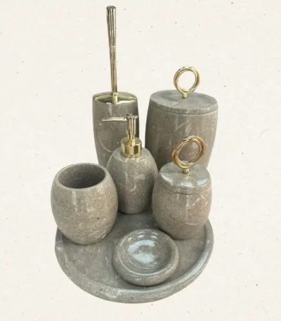 Mermer Banyo Setleri: Lüks dokunuşlarla tasarlanmış sabunluk, sıvı sabunluk, pamukluk, çöp kovası ve havluluk gibi parçalardan oluşan şık setlerle banyonuza düzen ve zarafet kazandırın.