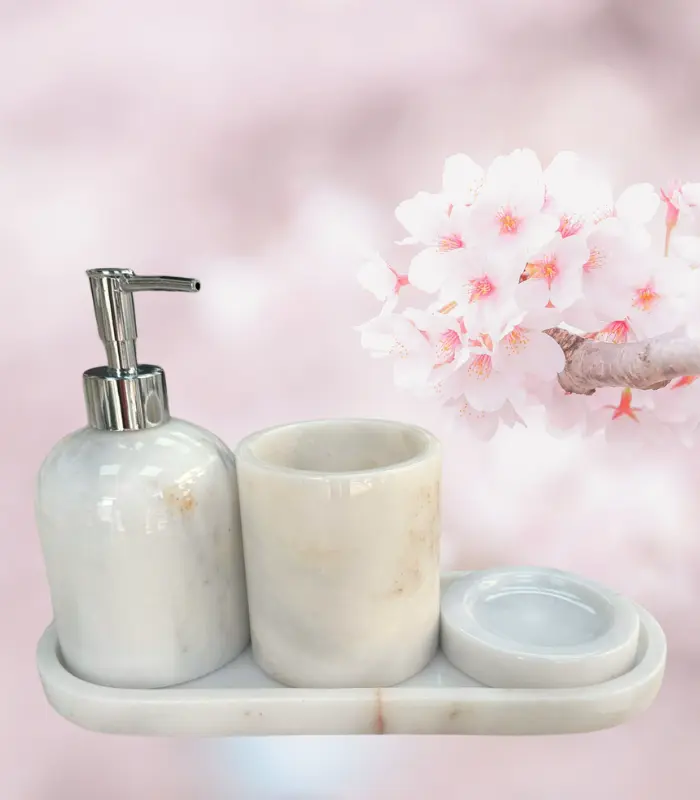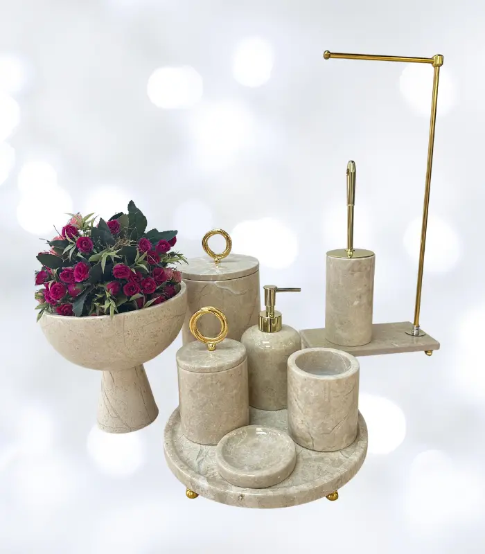 Beyaz Mermer Gümüş Detaylı 7’li Banyo Seti, doğal taş görünümü ve zarif gümüş detayları ile banyo dekorasyonunda lüksü ve sadeliği bir araya getiriyor.