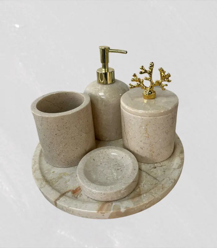 • Sıvı Sabunluk (Pompajlı): Altın renkli pompa başlığı ile estetik ve konforlu kullanım.